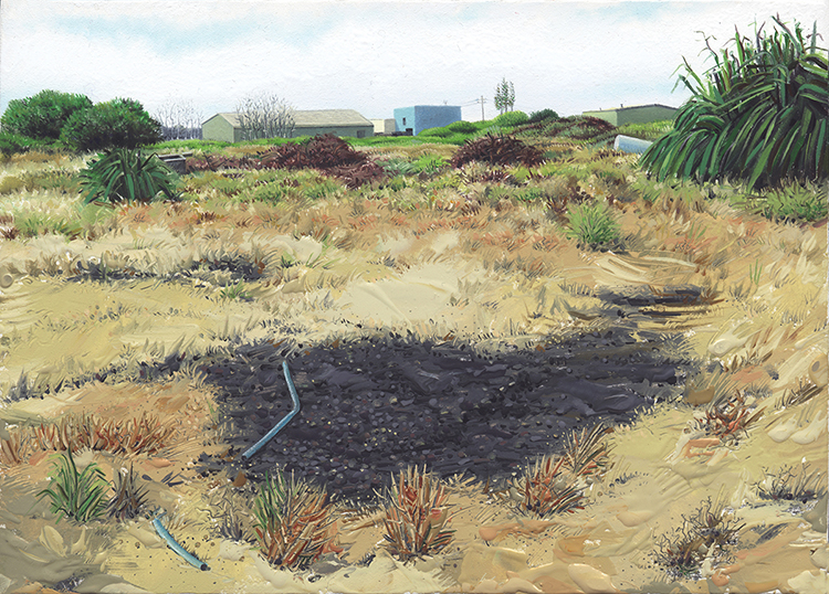 These paintings examine the myriad features of an abandoned and contaminated trainyard in Eureka, CA. The works describe this brownfield's many surface disruptions from hydrocarbon and lead contamination as well as the site's varied remediation efforts. (All works are 2002, oil on panel, 5"x7")