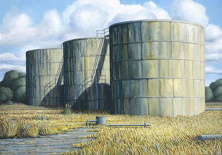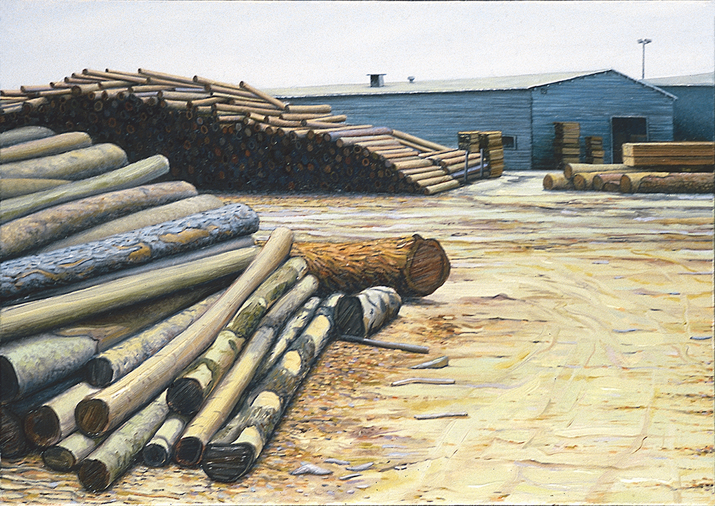 These paintings document the timber industry and related infrastructure in Humboldt County, California in the mid to late 1990s. This region's monumental log decks were once a ubiquitous sight—grand and metaphorical Ziggurats honoring the gods of progress and profit. Because of the depletion of historical timber stock (along with increased regulation and unpredictable cycles of market demand) far fewer of these iconic monuments are still around, though this industry remains regionally and internationally significant.