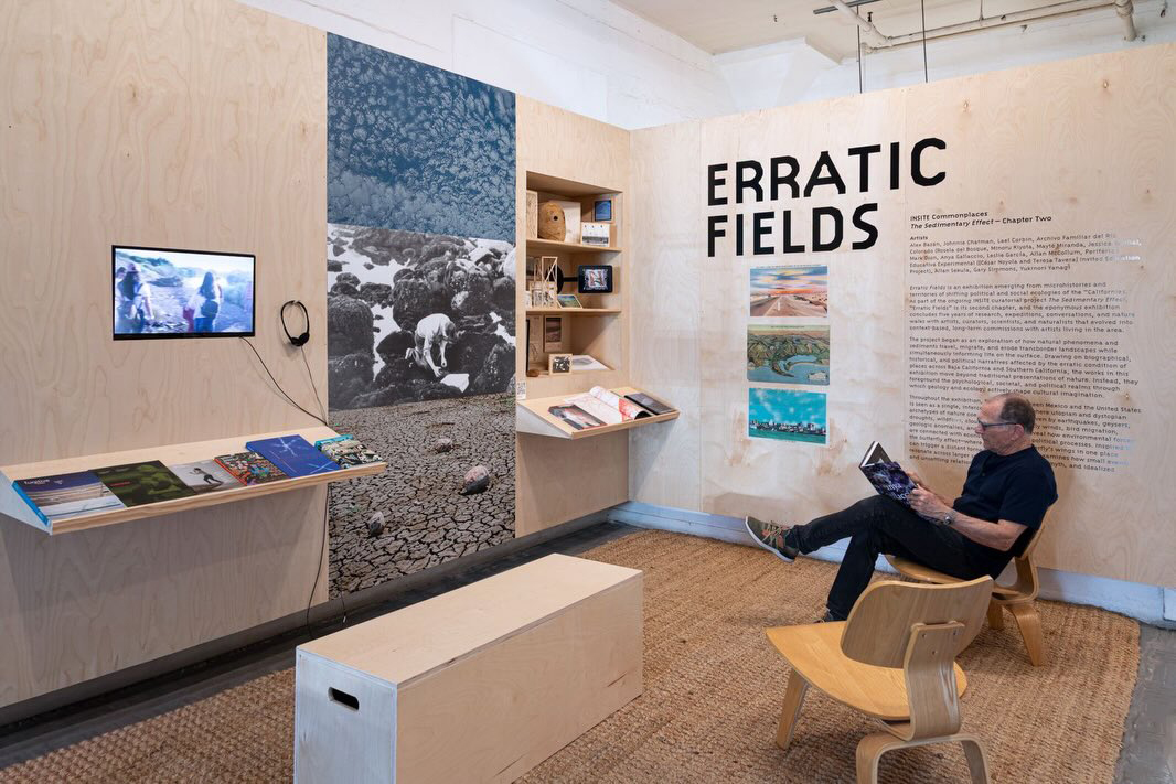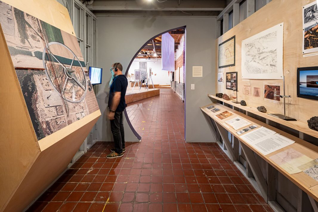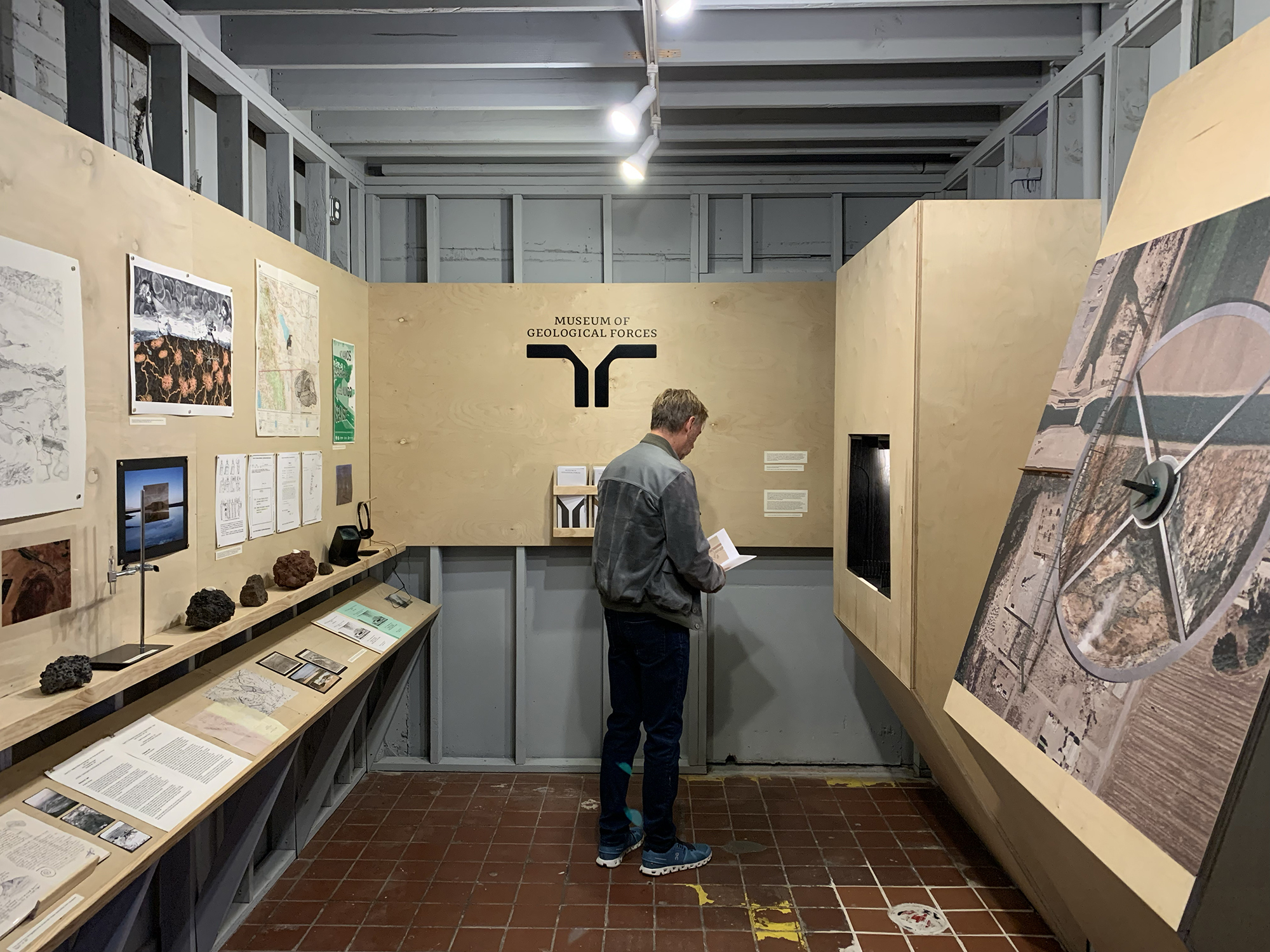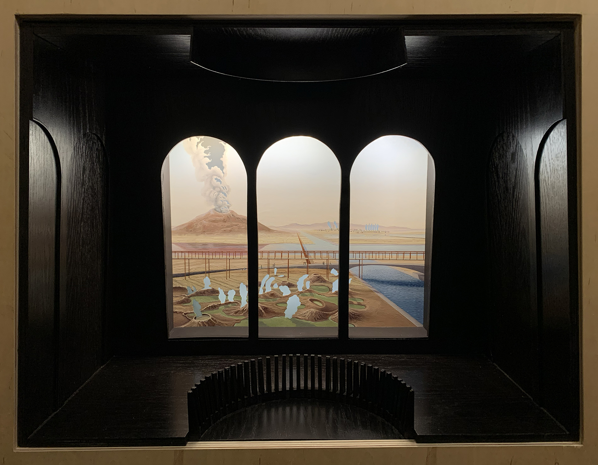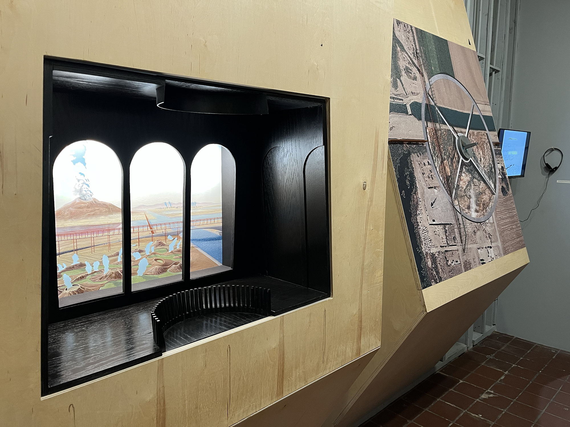 El Museo de las Fuerzas Geológicas (2026) propone un museo visionario que se extiende a ambos lados de la frontera en el territorio del Salton Trough, una gran cuenca tectónica y sedimentaria donde el río Colorado desemboca en el golfo de California en México. Mi pintura de diorama representa una vista desde las ventanas de este museo: un escenario en el que se hace realidad un futuro cooperativo basado en el uso compartido de los recursos hídricos y las energías renovables. Esta vista incluye el Canal All-American, el río Álamo, las instalaciones de energía geotérmica y los pozos de lodo geotérmico del mar de Salton, el volcán Cerro Prieto de Baja California y un puente peatonal entre México y Estados Unidos. Este proyecto es una colaboración con el colectivo de artistas Archivo Familiar del Río Colorado con sede en Mexicali, y el estudio de arquitectura Veintedoce, también con sede en Mexicali. Más información sobre la exposición Erratic Fields aquí