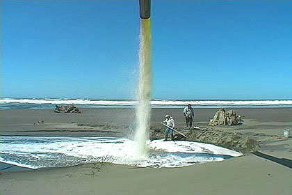 Bay Dredge examines the odd spectacle and unexpected formal elegance of an imposing effluent pipe that spewed its contents along a lovely beach in rural northern California in winter of 2007. This eleven mile-long pipe extended—vacuum cleaner-like—from a dredging barge at the local marina, across the marshes, and over the sand dunes to its final destination. The varied and distinctive contents of the bottom of Humboldt Bay were thus dramatically revealed to all who dared to venture near this powerful symbol of economic endurance. (© 2007, running time: 8 minutes.)