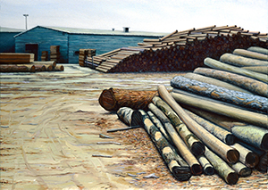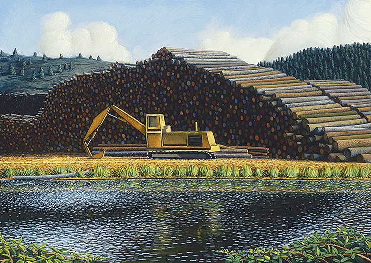 These paintings document the timber industry and related infrastructure in Humboldt County, California in the mid to late 1990s. This region's monumental log decks were once a ubiquitous sight—grand and metaphorical Ziggurats honoring the gods of progress and profit. Because of the depletion of historical timber stock (along with increased regulation and unpredictable cycles of market demand) far fewer of these iconic monuments are still around, though this industry remains regionally and internationally significant.