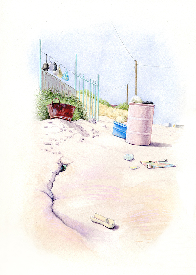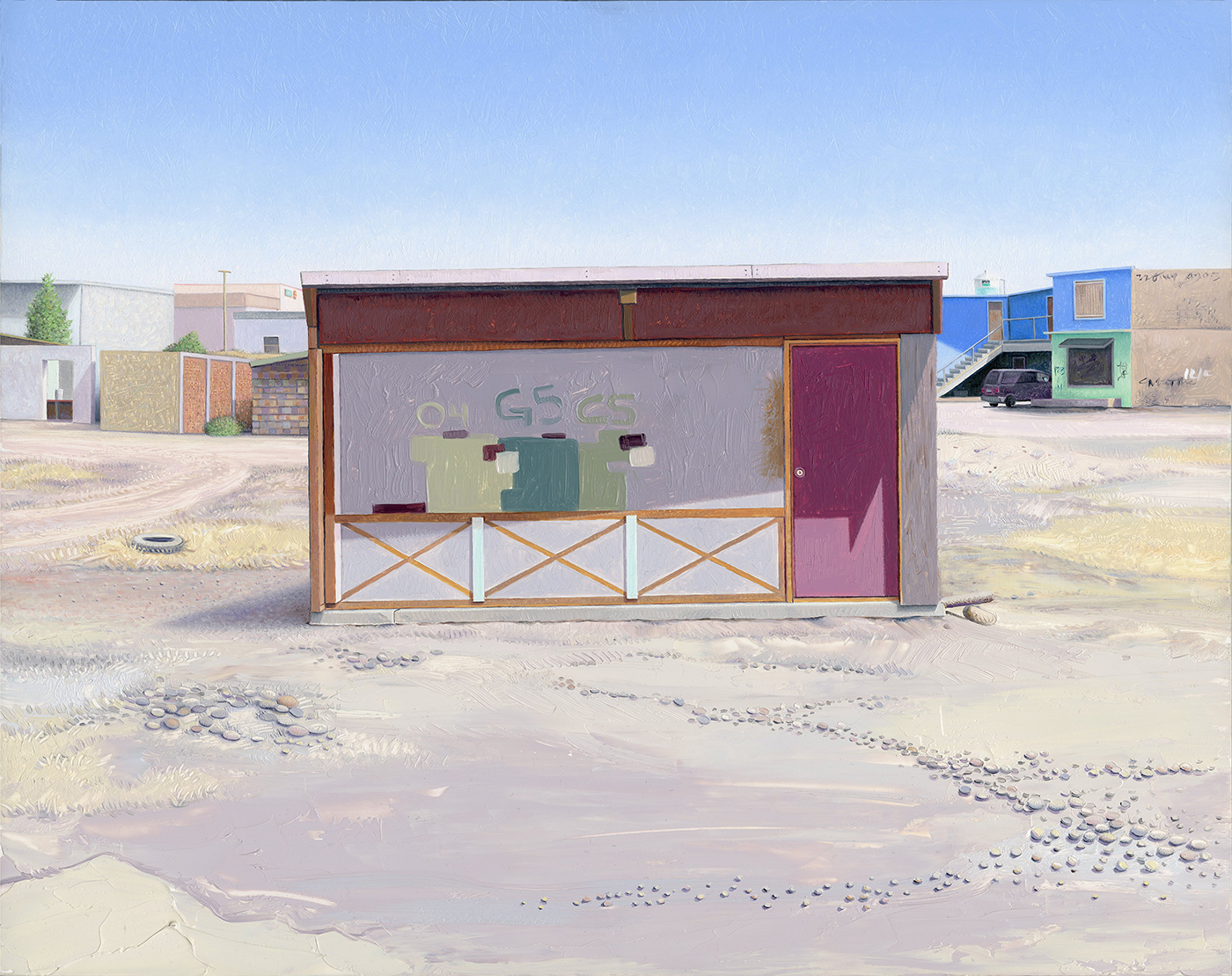 These oil and gouache paintings interpret the resourcefully improvised domestic dwellings and infrastructure of the once rapidly expanding working-class communities of Tijuana, Mexico. The oil paintings examine the repurposing of cast-off garage doors from vintage San Diego subdivisions to build sturdy four-walled Mexican homes. These garage doors—once an important façade component for mid-century American commuter homes—now function as the only façade for households that often cannot afford a car. This subtle irony—as well as these homes’ iconic beauty—is as compelling as the complex social and economic contingencies that shape these communities.